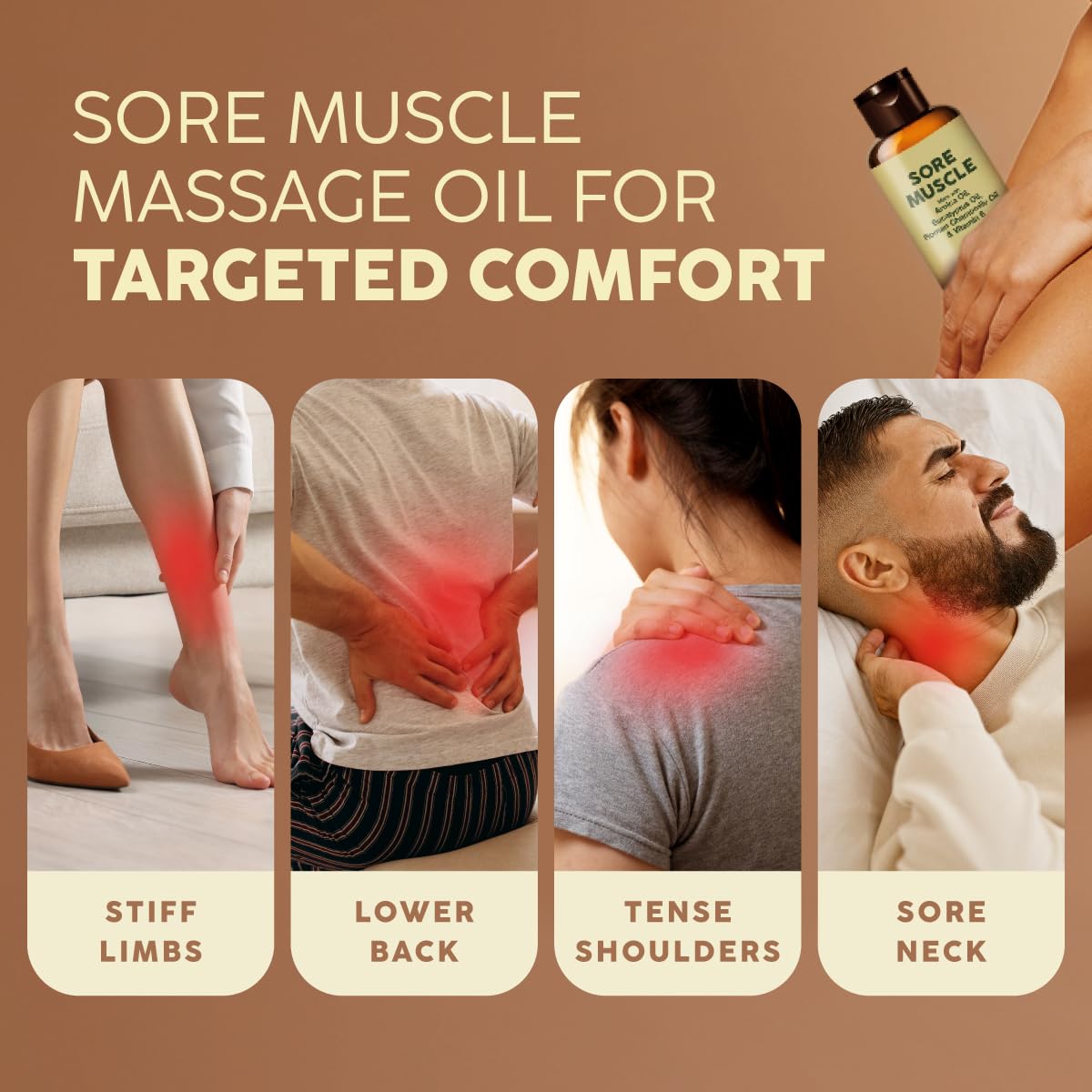 Chronic neck stiffness from sleeping wrong. Two weeks of nightly application and targeted massage completely resolved it.