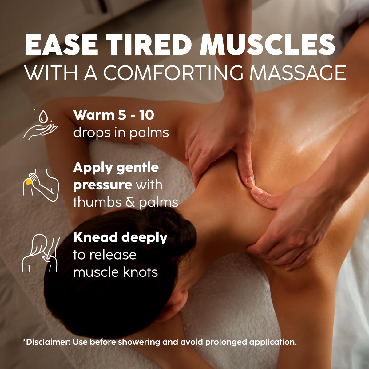 Roll out the tight spots then apply this oil to the worked areas. The combination provides deeper relief than either alone.